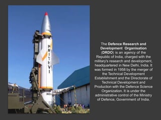 The Defence Research and Development Organisation (DRDO) is India's government agency responsible for military research and development. It was formed in 1958 by merging several defence research organizations. DRDO works under the Ministry of Defence to develop advanced weapons and technologies for the Indian armed forces. It carries out research and development in various fields such as aeronautics, armaments, combat engineering, electronics, missiles, and naval technologies. Some of DRDO's major projects include developing the Tejas LCA, Arjun and T-90 tanks, BrahMos missile, and the Prithvi and Agni ballistic missiles.