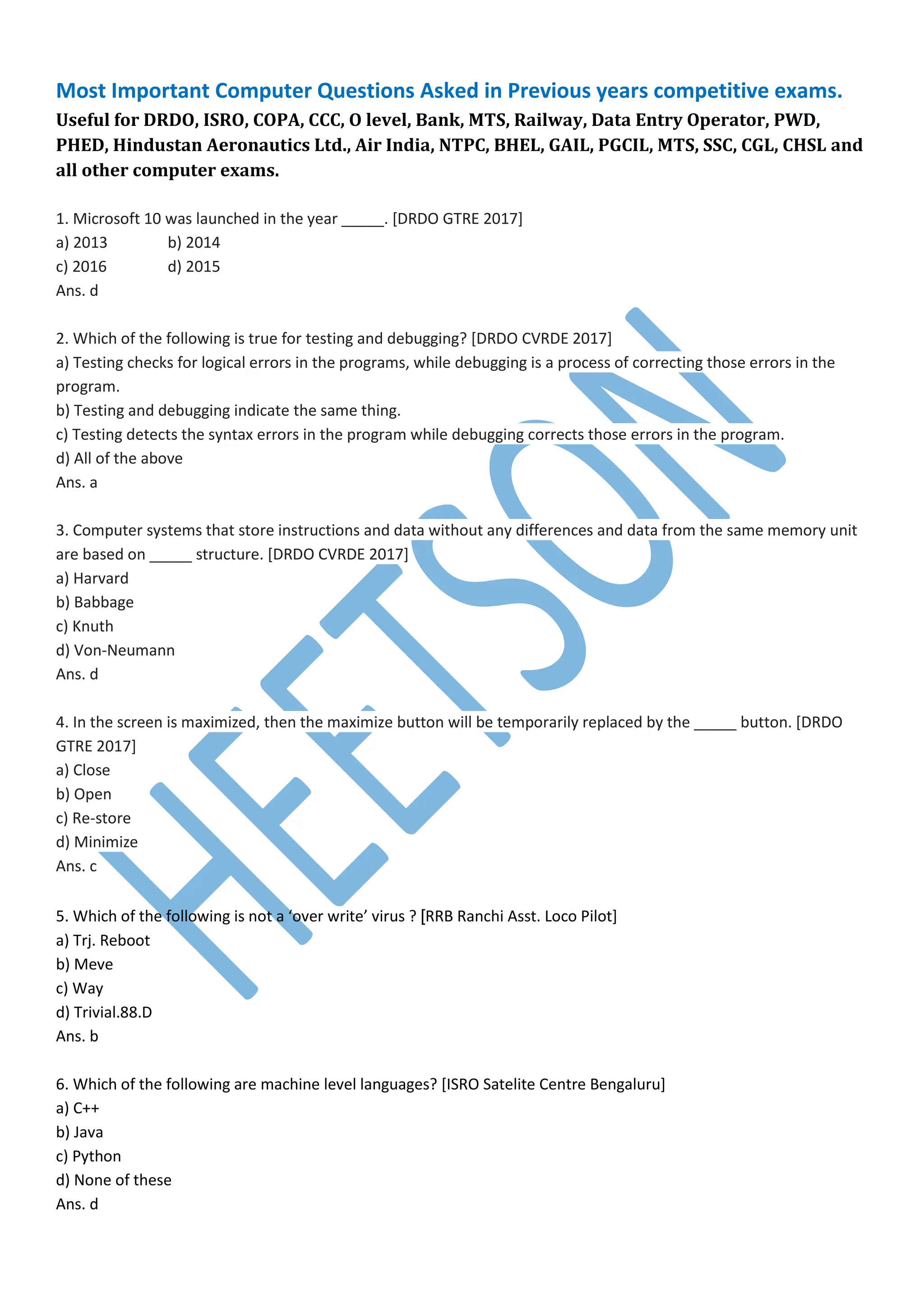 The document contains a compilation of important computer questions from past competitive exams, relevant for various organizations and tests including DRDO, ISRO, and SSC. It covers a range of topics such as operating systems, programming languages, data structures, and computer architecture, with example questions and their answers. The content serves as a useful resource for individuals preparing for computer-related examinations.