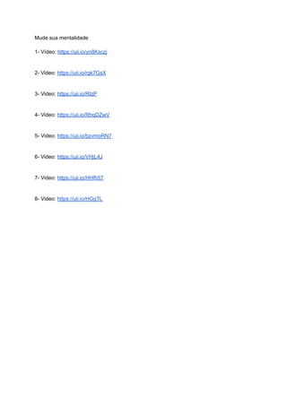 This document provides a list of 8 video links intended to help change one's mindset. The videos cover topics related to shifting perspectives and thought patterns in a positive direction. Viewing the full set of videos may offer guidance and strategies for developing a renewed outlook.