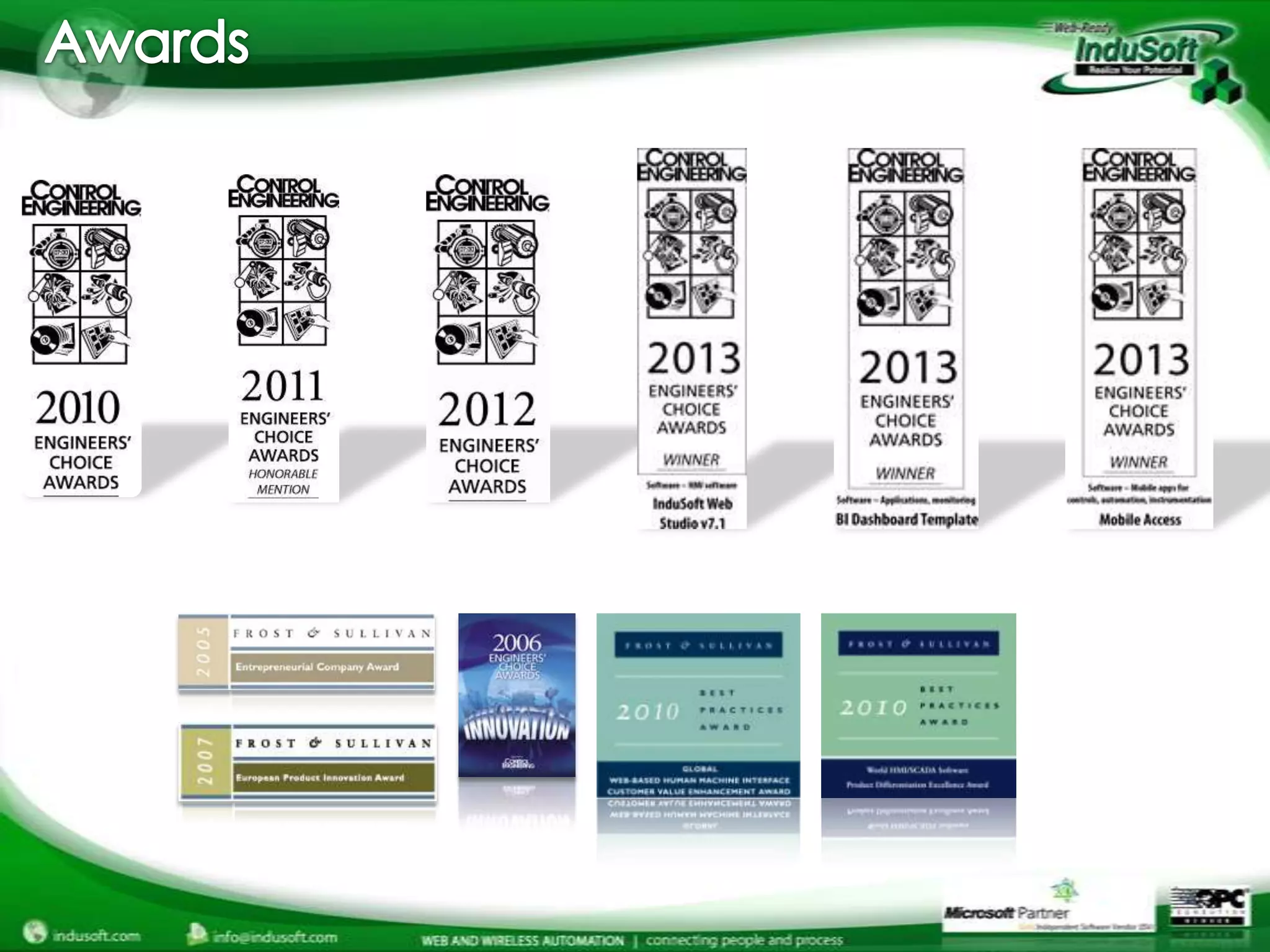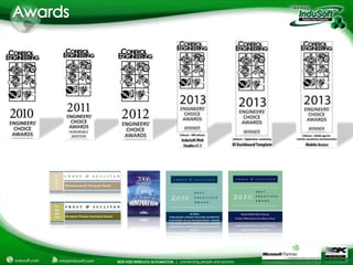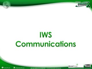 The document outlines the communication capabilities of IWS with various devices and standards, emphasizing its reporting tools which support multiple output formats. Established in 1997, IWS is a pioneer in HMI/SCADA solutions with features like database connectivity and mobile access. It includes extensive product customization options and resources for development and support.