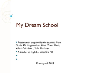 This document presents a proposal for a dream school. The school building would be modern and use robots to assist with tasks. Students would live at the school from Monday to Thursday and have flexible schedules, choosing their own subjects and class times. Lessons would last 35 minutes with an hour-long break for eating restaurant food. Students could explore the school until 10pm and go to bed at 11pm. The school year would be shorter, occurring in October, November, February, March and April. Teachers would be young and kind. Internet resources with photos of dream schools are provided.