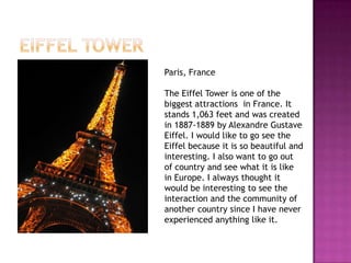 The document discusses several famous landmarks and historical sites around the world that the author would like to visit, including the Eiffel Tower in Paris, the Colosseum in Rome, the Leaning Tower of Pisa in Italy, the Great Wall of China, and the Taj Mahal in India. The author notes their interest in experiencing other cultures and learning more about world history by seeing these sites in person.