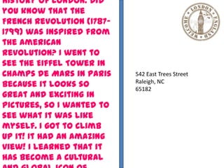 The document appears to be a collection of letters describing travels to various locations. The letters discuss visits to London, Paris, India, Hawaii, and California. For each location, notable sights are mentioned including the Eiffel Tower, Taj Mahal, beaches in Hawaii, the Hollywood sign, and the San Diego Zoo. Images are included and cited at the end to accompany each location.