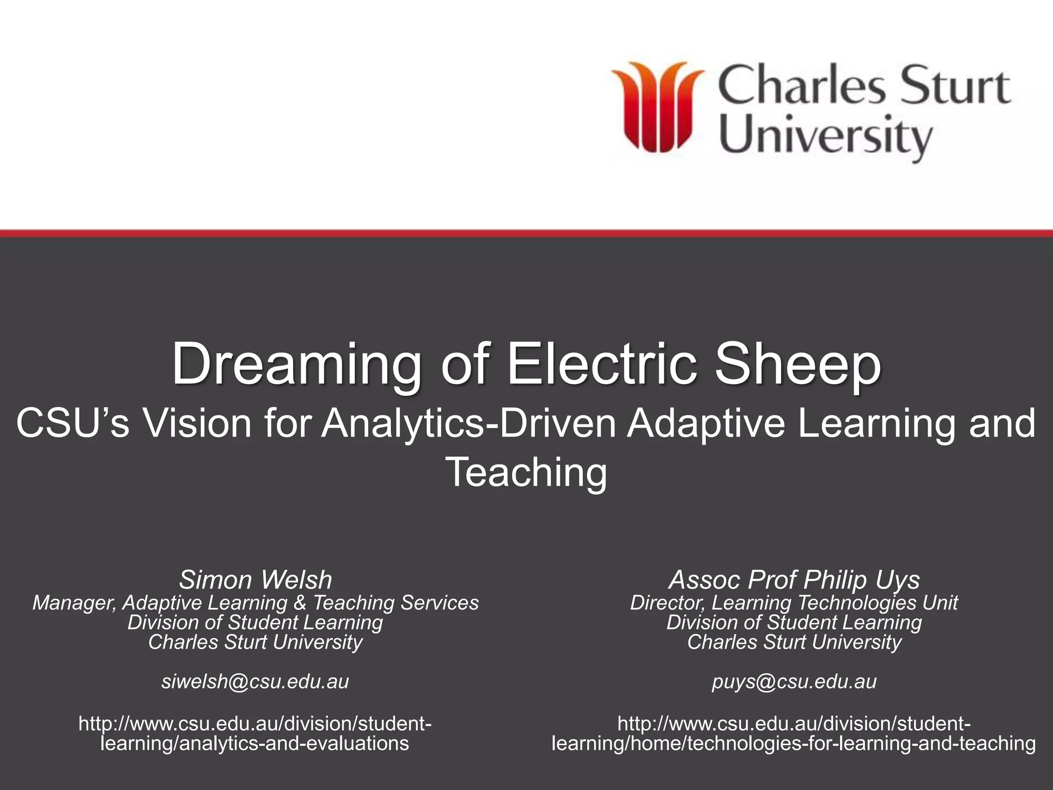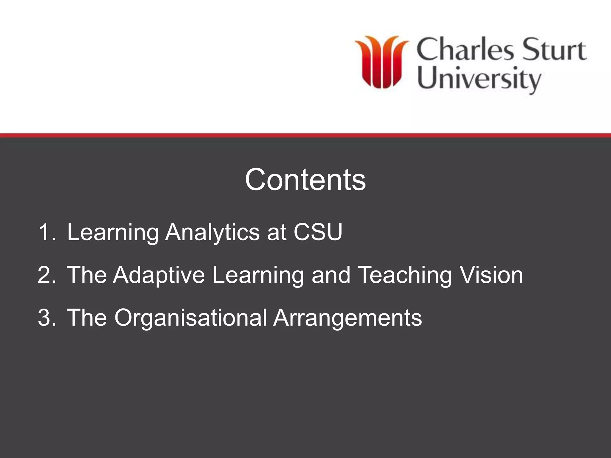 This document outlines Charles Sturt University's vision for analytics-driven adaptive learning and teaching. It discusses CSU's establishment of a learning analytics strategy and team in 2013. The vision goes beyond typical institutional approaches by focusing on adaptation during learning through analysis of knowledge representations and students' digital footprints. It also recognizes learning analytics as a learning design challenge. To support this vision, CSU developed the Adaptive Learning and Teaching Services team to build capability among staff and partner with academics on research.