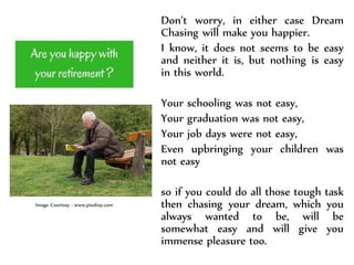 The document discusses how chasing dreams in one's "second inning" of life after retirement can be easier than it seems. It notes that at this stage, one has no major responsibilities, is their own boss, and has 24 hours a day to devote to a dream. It encourages utilizing experience gained over 35-40 years of work and taking calculated risks. It emphasizes the importance of staying healthy through exercise and diet to better pursue dreams. Examples of people who achieved dreams late in life are provided to inspire positive thinking about one's potential in this phase of life.