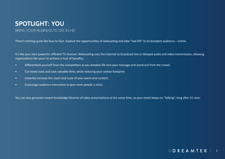Dreamtek provides webcasting services that allow businesses to engage a broader audience through live or on-demand broadcasts, improving interaction and reducing costs. Utilizing Adobe Connect, Dreamtek offers customizable solutions with high-quality video capabilities, interactive tools, and support for various business needs. Their comprehensive approach includes a step-by-step guide for successful webcasting, including strategy formulation, technical preparations, and post-event content management.