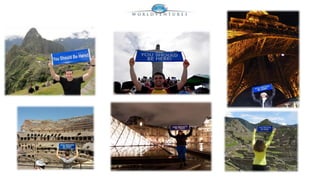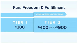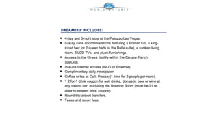 This document provides information on travel packages and membership options for DreamTrips, a travel club. It outlines all-inclusive vacation packages to locations like Costa Rica, Greece, Bali, and Tenerife. It also describes membership levels that provide access to travel deals, concierge services, and recurring savings on bookings. The document promotes the opportunity to earn income by referring new members and receiving commissions on their bookings and referrals. It highlights training opportunities, compensation plans, and the ability to have monthly membership fees waived through referrals.