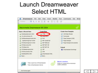 The document provides instructions for using Macromedia Dreamweaver MX2004 to design and build basic web pages, including how to set page properties, insert text, images, tables, links, and navigation buttons, and preview pages in a web browser before saving and uploading files to a web server. It also discusses file organization and naming conventions best practices.