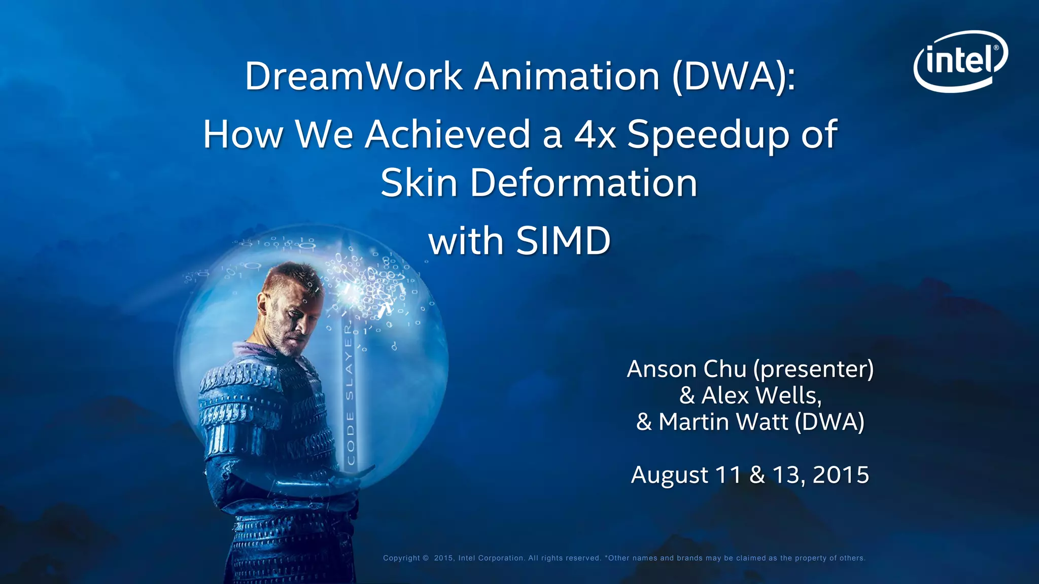 DreamWorks Animation achieved a 4x speedup in skin deformation for character animation by utilizing SIMD (Single Instruction, Multiple Data) instructions. Anson Chu, Alex Wells, and Martin Watt of DreamWorks Animation presented on how they optimized their skinning deformation algorithm using SIMD at an Intel conference in August 2015. The presentation covered legal disclaimers and information regarding the use of Intel products and benchmarks.