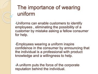 The document provides guidelines for employees on properly wearing the company uniform. It states that uniforms help customers identify employees, inspire confidence by showing the employee is a professional, and represent the corporate reputation. It then gives details on how the uniform should be worn correctly for both male and female staff, including guidelines on makeup, hair, shoes, accessories, and more. The most important accessory mentioned is to smile.