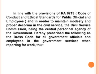 The document outlines a dress code for all government officials and employees in the Philippines. It establishes guidelines for appropriate and prohibited attire. Appropriate office attire includes prescribed uniforms or business clothing like polo shirts and blouses. Prohibited clothing includes transparent tops, mini skirts, sandals, and ostentatious jewelry. Some exemptions allow variation for religious reasons, disabilities, pregnancy, or mourning. Non-compliance is subject to disciplinary action including reprimand, suspension, and potential dismissal.
