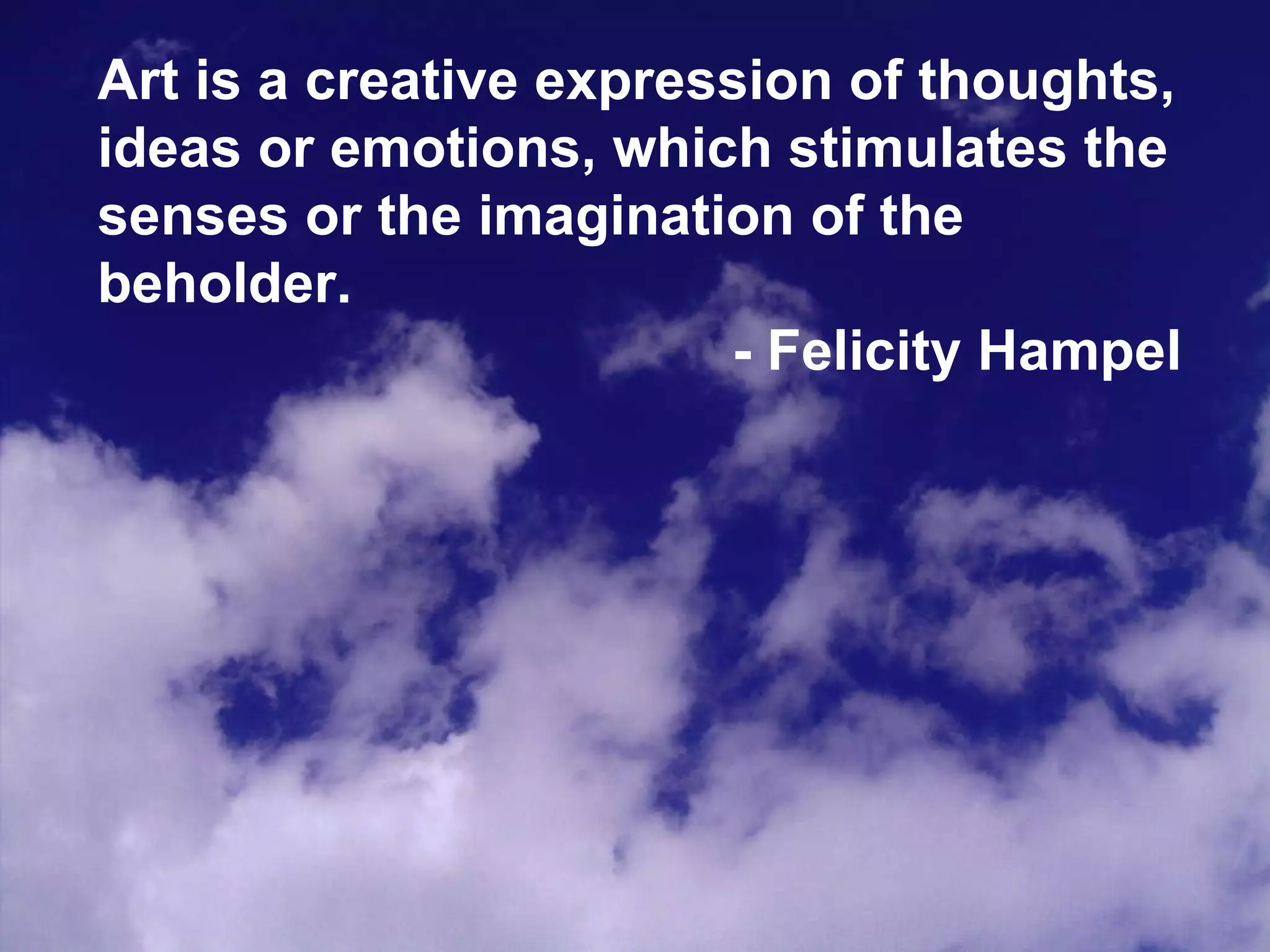 Art is a creative expression that stimulates the senses or imagination according to Felicity Hampel. Picasso believed that every child is an artist but growing up can stop that creativity. Aristotle defined art as anything requiring a maker and not being able to create itself.