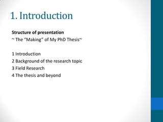 The document summarizes the author's PhD thesis on the transformation of Islamic learning in Malay Muslim society. It describes the background and motivation for the research topic, the field research conducted in Kedah and Kuala Lumpur, and how the thesis was written. The thesis argued that while Islamic learning has transformed with the introduction of modern schooling, there are also minor but meaningful movements seeking to redirect this transformation by reserving traditional elements of learning.