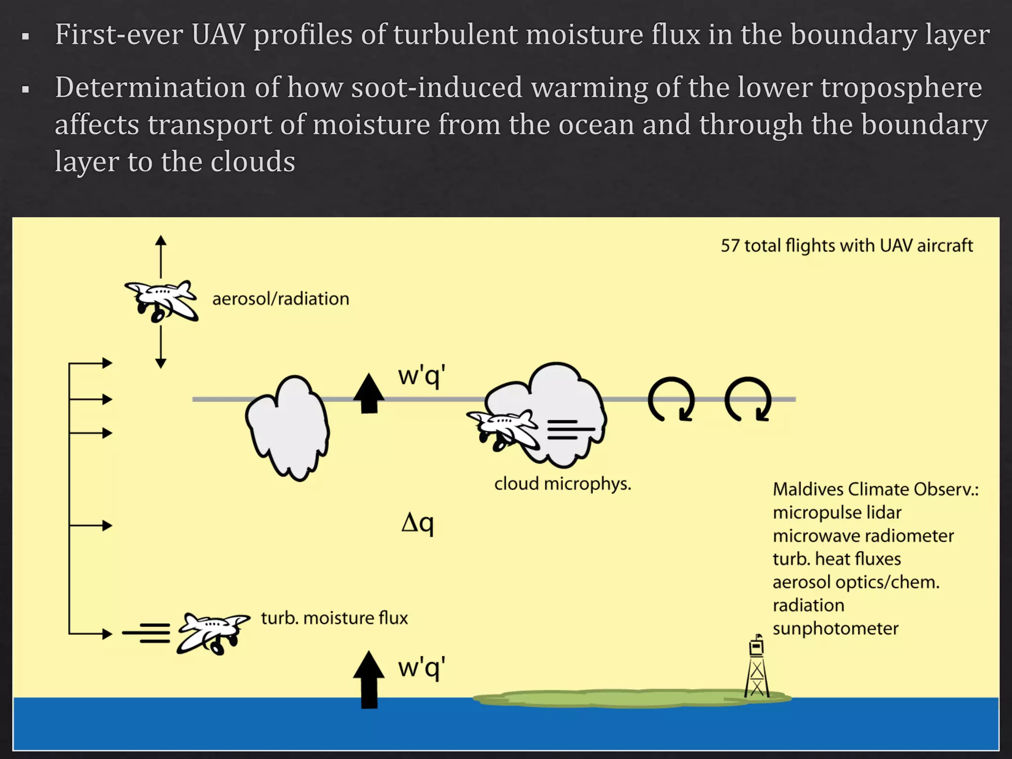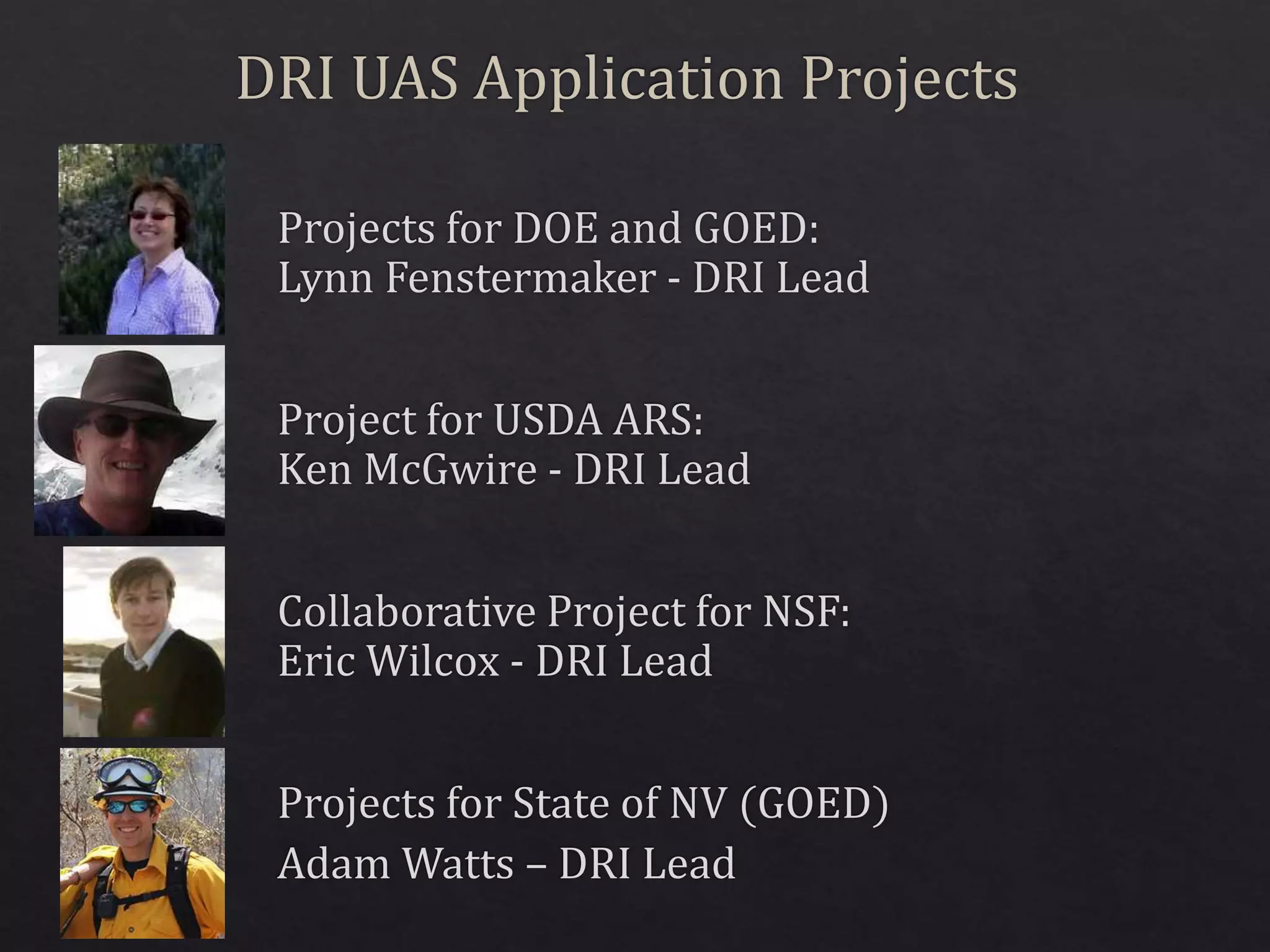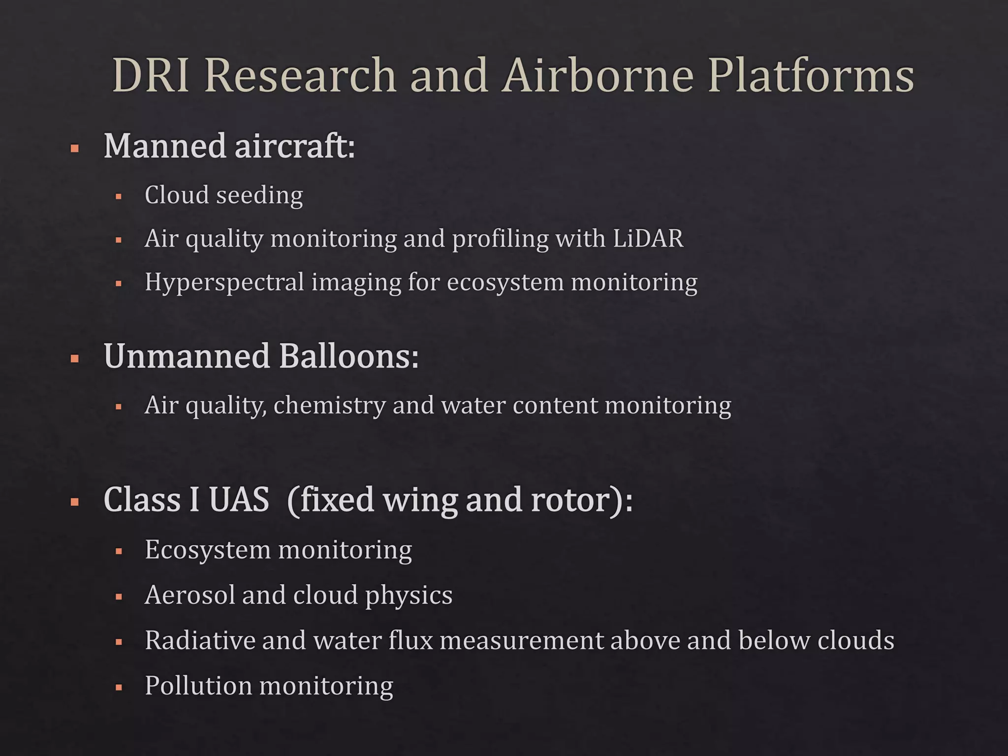 The document outlines various projects and technologies developed by the Desert Research Institute, including a large T-probe for measuring cloud properties and a UAS platform for assessing climate change treatment effects. It highlights the use of multispectral cameras and UAS technology for efficient landscape characterization and improved data collection for soil and ecosystem analysis. The research collaborations also focus on biological soil crust assessment and the development of miniaturized technology for cloud seeding tests.
