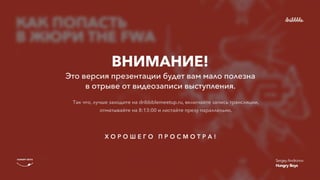 Эта версия презентации будет вам полезна только при параллельном просмотре с записью выступления. Поэтому заходите на http://dribbblemeetup.ru/#brdcst отматывайте на 8:13:00 и листайте презентацию.