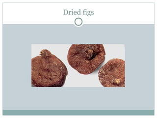 This document lists various types of dried fruits including figs, pears, peaches, apricots, prunes, dates, bananas, currants, raisins, and sultanas. It also lists several nuts such as walnuts, pecans, Brazil nuts, cashews, almonds, hazelnuts, filberts, peanuts, chestnuts, pistachios, macadamias, and pine nuts. Additionally, it mentions pumpkin seeds, sunflower seeds, and acorns.