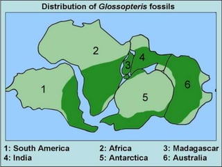 Glossopteris fossils provide evidence that continents like Africa, Australia, India and Antarctica were once connected. The large seeds of Glossopteris could not have been dispersed vast ocean distances by wind or water. Similarly, Mesosaurus fossils found in South America, Africa and Antarctica indicate these continents were once joined, as these reptiles could not have swam between continents. Reconstructing Pangaea relies on clues from fossil matches between continents and the matching edges of continental plates.