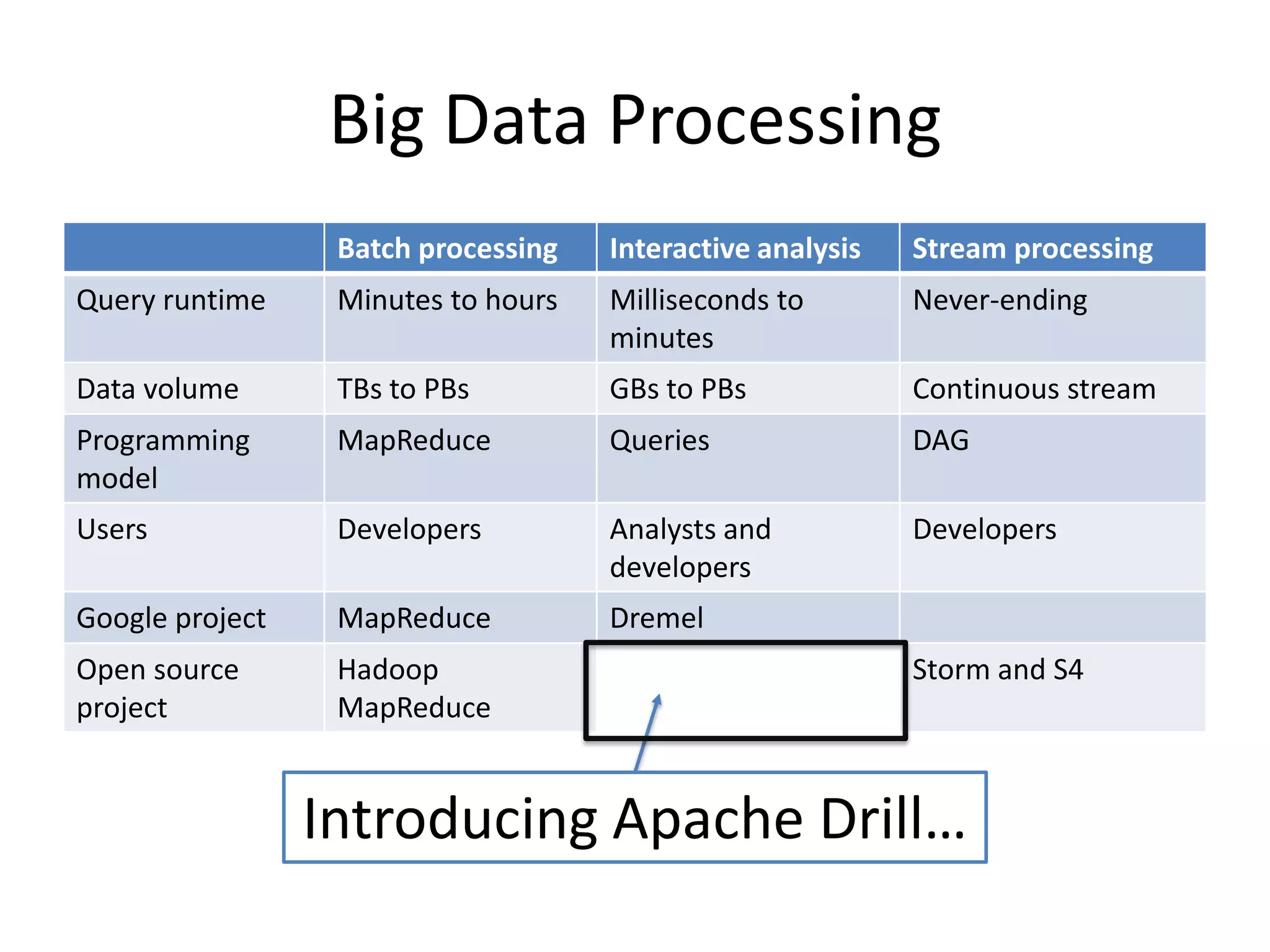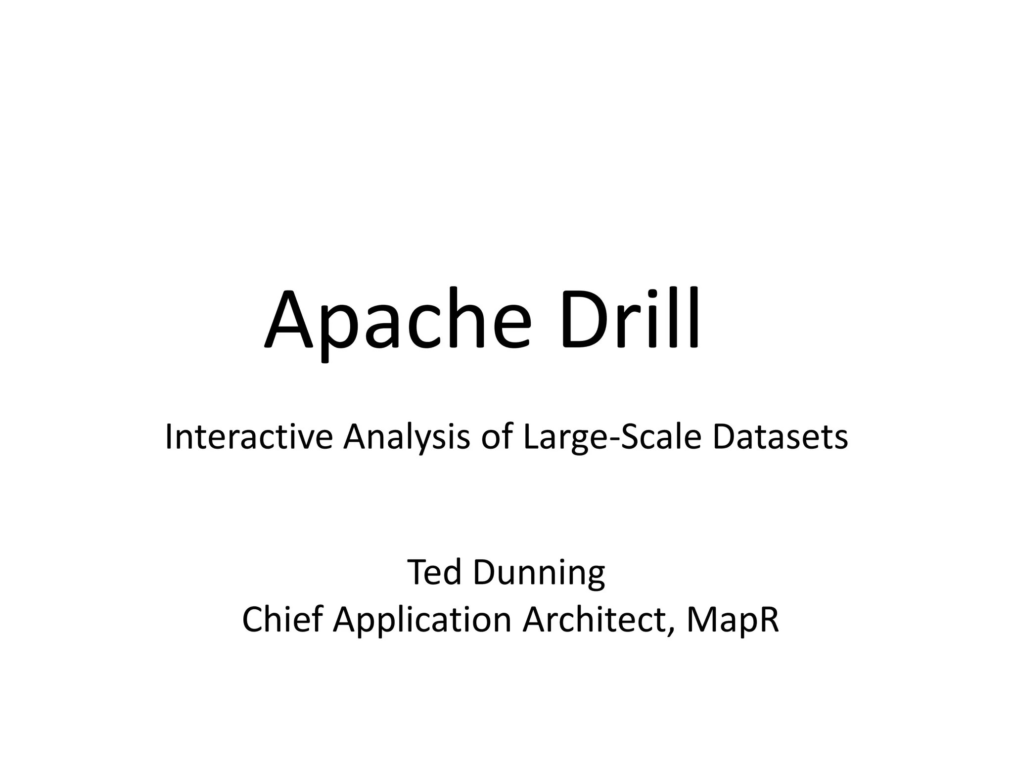 Apache Drill is an open source engine for interactive analysis of large-scale datasets. It was inspired by Google's Dremel, which allows interactive querying of trillions of records at fast speeds. Drill uses a SQL-like language called DrQL to query nested data in a column-based manner. It has a flexible architecture that allows pluggable query languages, execution engines, data formats and sources. Drill aims to be fast, flexible, dependable and easy to use for interactive analysis of big data.