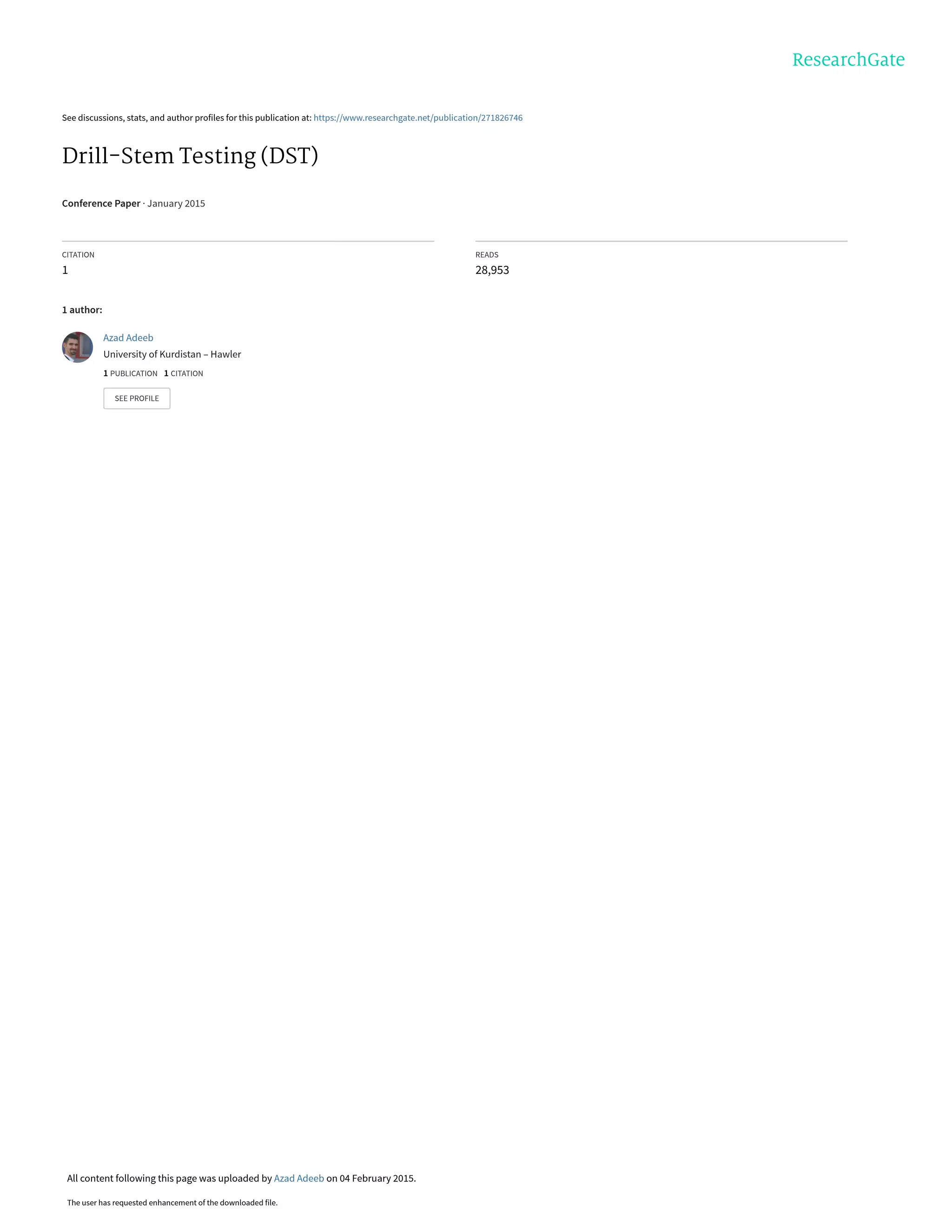 The document discusses drill stem testing (DST), which is used to evaluate reservoir properties. It describes the key components of a DST tool, including pressure recorders, test valves, packers, and more. It also outlines the steps to design a DST plan, considering factors like the test interval, packer selection and location, choke selection, and more. Finally, it explains how to execute a DST, interpreting the pressure chart by describing the initial flow, initial shut-in, final flow, and final shut-in periods marked on a sample chart.