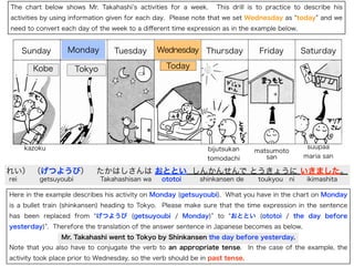 The document provides a detailed guide for describing Mr. Takahashi's weekly activities using Japanese time expressions, focusing on regular verb conjugation for past and future actions. Each day's activity is illustrated with examples, demonstrating how to convert day expressions to relevant temporal phrases, from 'the day before yesterday' to 'two days after tomorrow.' The document serves as a drill for practicing sentence construction and verb conjugation in context.