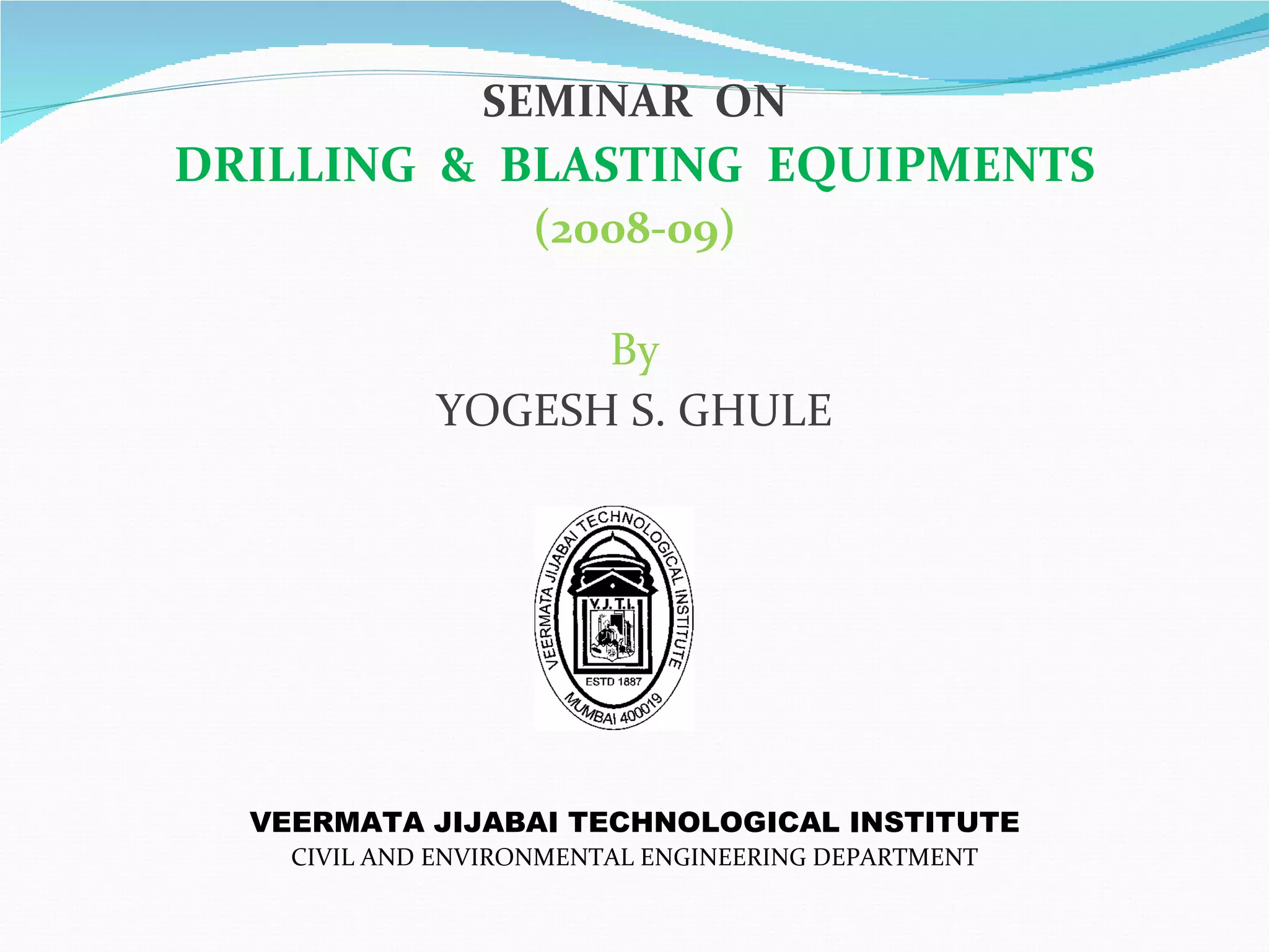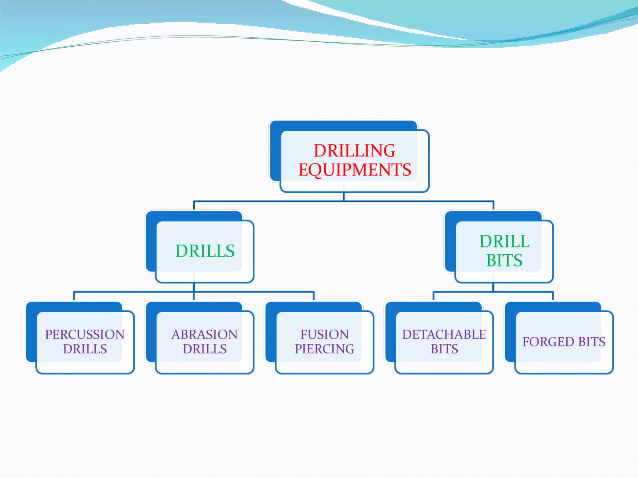 The document summarizes drilling and blasting equipment used in mining and construction. It describes various types of drills like percussion drills, abrasion drills, and fusion piercing. It also discusses components of drilling like drills, drill bits, and different drilling patterns. The document then explains the blasting process which involves using explosives like dynamite, detonators, fuses, and blasting caps. Proper handling and transportation of explosives is important for safety. The blasting procedure involves making blast holes, inserting charges, tamping, and detonating with a fuse or detonator.