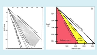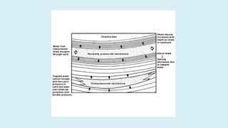 This document summarizes several potential problems that can occur while drilling beds, including abnormal pressure, unconsolidated formations, shale instability, key seats, and ledges. Abnormal pressure can result from rapid sedimentation, evaporite deposition, piezometric surface contrasts, diagenesis processes, tectonic activity like folding and faulting, salt diapirism, and uplift. Unconsolidated formations can cause particles to separate and fall downhole. Shale instability can occur through mechanical or chemical mechanisms involving swelling and weakening. Key seats refer to wear points where the drill string changes direction. Ledges form from sequential soft, hard, and fractured formations wearing differently and potentially sticking the drill string.
