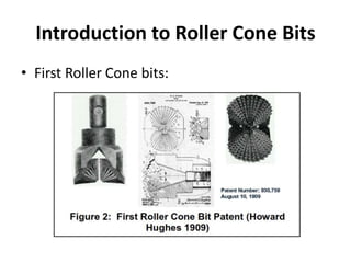 The document introduces roller cone bits, covering their design elements, including cone geometry, tooth and insert structures, and materials used in manufacturing. It discusses critical aspects like heat treatment, hardfacing, and the importance of bearings and seals in terms of performance and durability. Additionally, it emphasizes the need for quality engineering to ensure the effective operation of seals and bearings under harsh conditions.