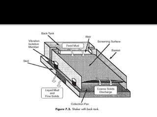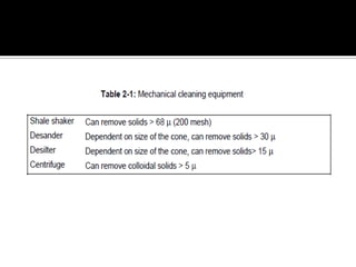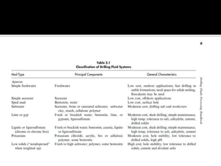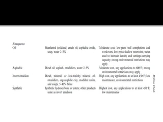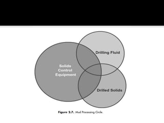 A drilling fluid, or mud, is circulated during drilling operations to carry cuttings to the surface, control formation pressure and maintain wellbore stability, cool and lubricate the drill bit, and minimize damage to the reservoir. There are three main types of drilling fluids: gaseous (such as air), aqueous (such as water-based muds containing clay or polymer), and non-aqueous (such as oil-based or synthetic-based muds). Cuttings are removed from the drilling fluid using various solids control equipment and processes at the surface. Working with drilling fluids requires safety precautions as some components can be hazardous if not properly handled.