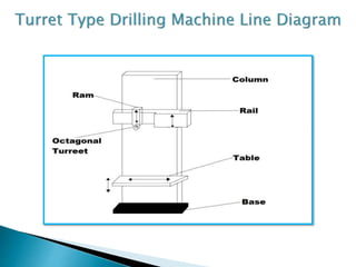 The document provides an overview of drilling machines, detailing their various components, functions, and types such as portable, sensitive, and upright drilling machines. It explains how drilling machines operate to produce holes in materials and lists specific operational capabilities, including drilling and tapping processes. Additionally, the document outlines the specifications and construction features of different drilling machine types, emphasizing their importance in industrial applications.