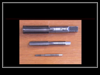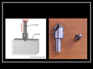This document discusses drilling machines and drilling operations. It describes different types of drilling machines including bench drilling machines, radial drilling machines, and upright drilling machines. It also covers drilling tools and operations such as reaming, boring, counterboring, countersinking, spot facing and tapping. Safety precautions for operating drilling machines and definitions of cutting speed, feed rate, and depth of cut are provided.