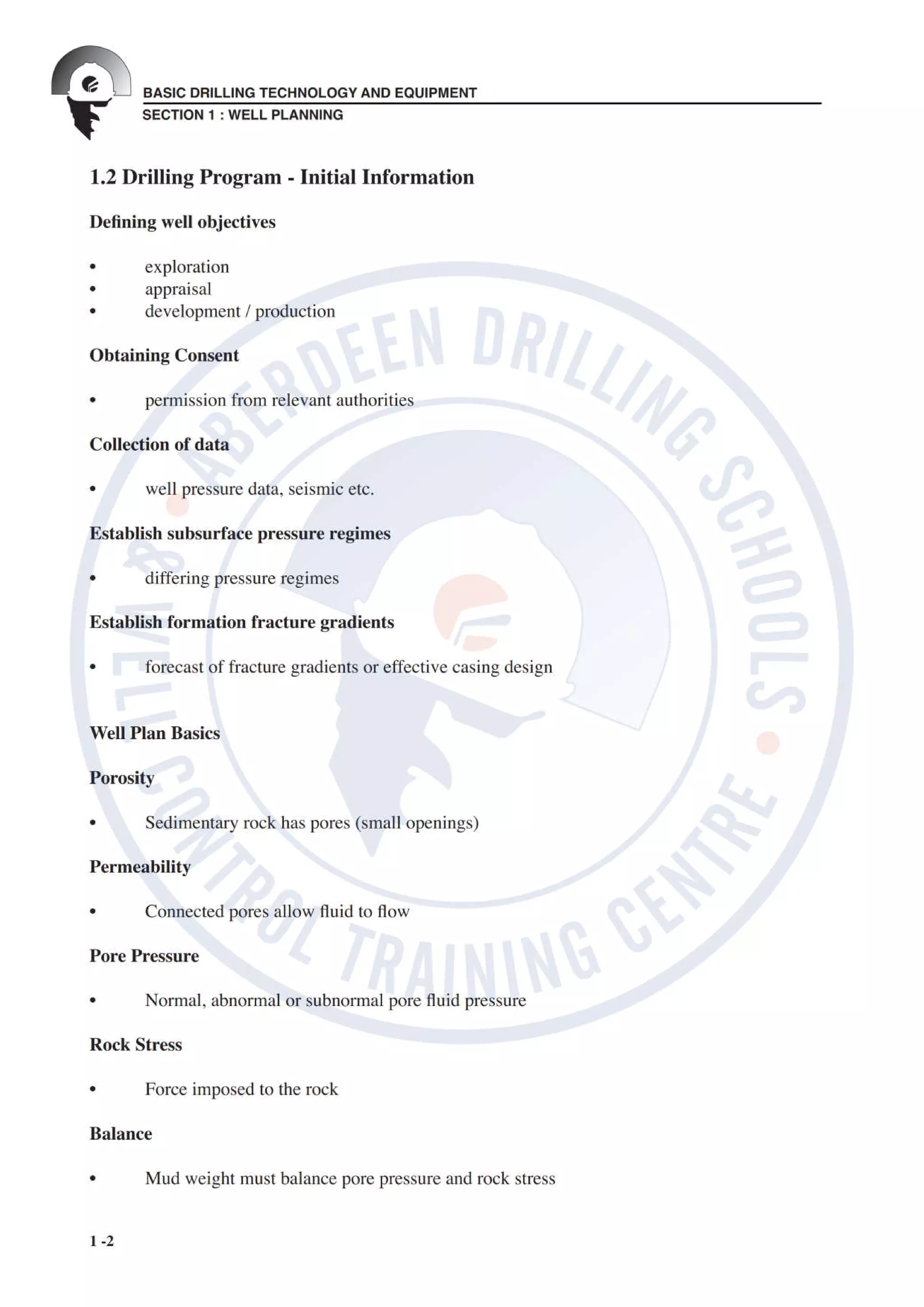 The document outlines comprehensive well planning and drilling technology, detailing the essential components of a drilling program including well objectives, site preparation, casing design, and mud program. It emphasizes the importance of determining formation pressures, selecting appropriate drilling fluids, and adhering to operational procedures. The summary encapsulates the preparation stages required for effective drilling, encompassing equipment selection and reporting requirements.