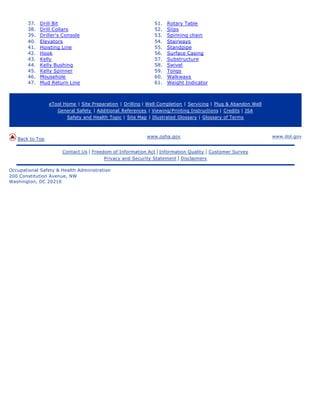 This document from the Occupational Safety & Health Administration provides an illustrated glossary of drilling rig components. It includes photos and definitions of over 60 different parts of a drilling rig, from major components like the derrick, drawworks, and blowout preventer, to smaller tools like tongs, slips, and elevators. Each item includes a photo and brief 1-2 sentence definition of its purpose. Additional navigational links are provided at the top and bottom of the page to related drilling safety topics.