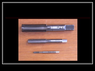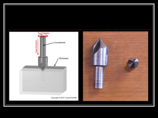 This document discusses different types of drilling machines and their functions. It describes bench drilling machines as light duty machines used in small workshops that can drill holes from 1 to 15 mm in diameter. Radial drilling machines are heavy duty machines used to drill larger holes, up to 7.5 cm, in heavy workpieces by moving the drill bit using a horizontal arm that can traverse and swing 360 degrees. The document also covers drilling machine operations like reaming, boring, counterboring, countersinking, spot facing and tapping.
