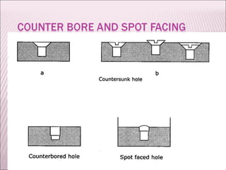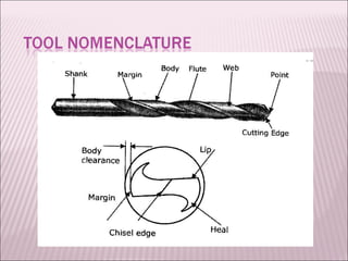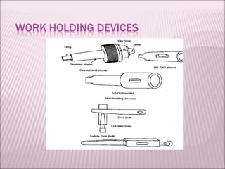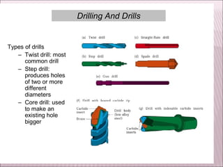 The document discusses drilling operations and drilling machines. It describes how drilling is performed using a rotating cutter called a drill. Drilling machines hold the workpiece stationary and rotate the drill to make a hole. Common types of drilling machines include portable, sensitive, radial, upright, gang, and multi-spindle machines. Drilling operations can include center hole drilling, deep hole drilling, thin material drilling, and pilot hole drilling. Safety precautions are important when using drilling machines.