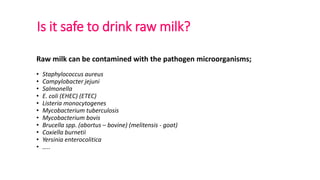 Raw milk can contain harmful pathogens. Pasteurization and ultra-high temperature (UHT) processing are used to kill pathogens and extend shelf life. Pasteurization heats milk to 63°C for 30 minutes or 72°C for 15 seconds, while UHT heats milk to 135°C for 2-5 seconds, allowing milk to be stored unrefrigerated for months. UHT gives milk a longer shelf life and is more economical for packaging, storage, and transportation than pasteurized milk.