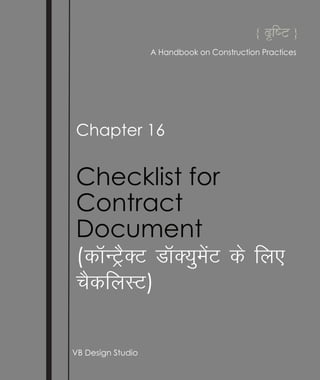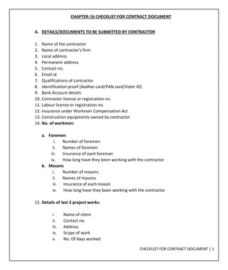 Chapter 16 outlines the checklist for contract documentation in construction, detailing required contractor information, work specifications, and clauses for contract management. Key topics include work schedule preparation, quality assurance, safety measures, and compliance with labor laws. It also highlights the contractor's responsibilities in case of defective work, project delays, and site safety, alongside provisions for payment and completion certification.