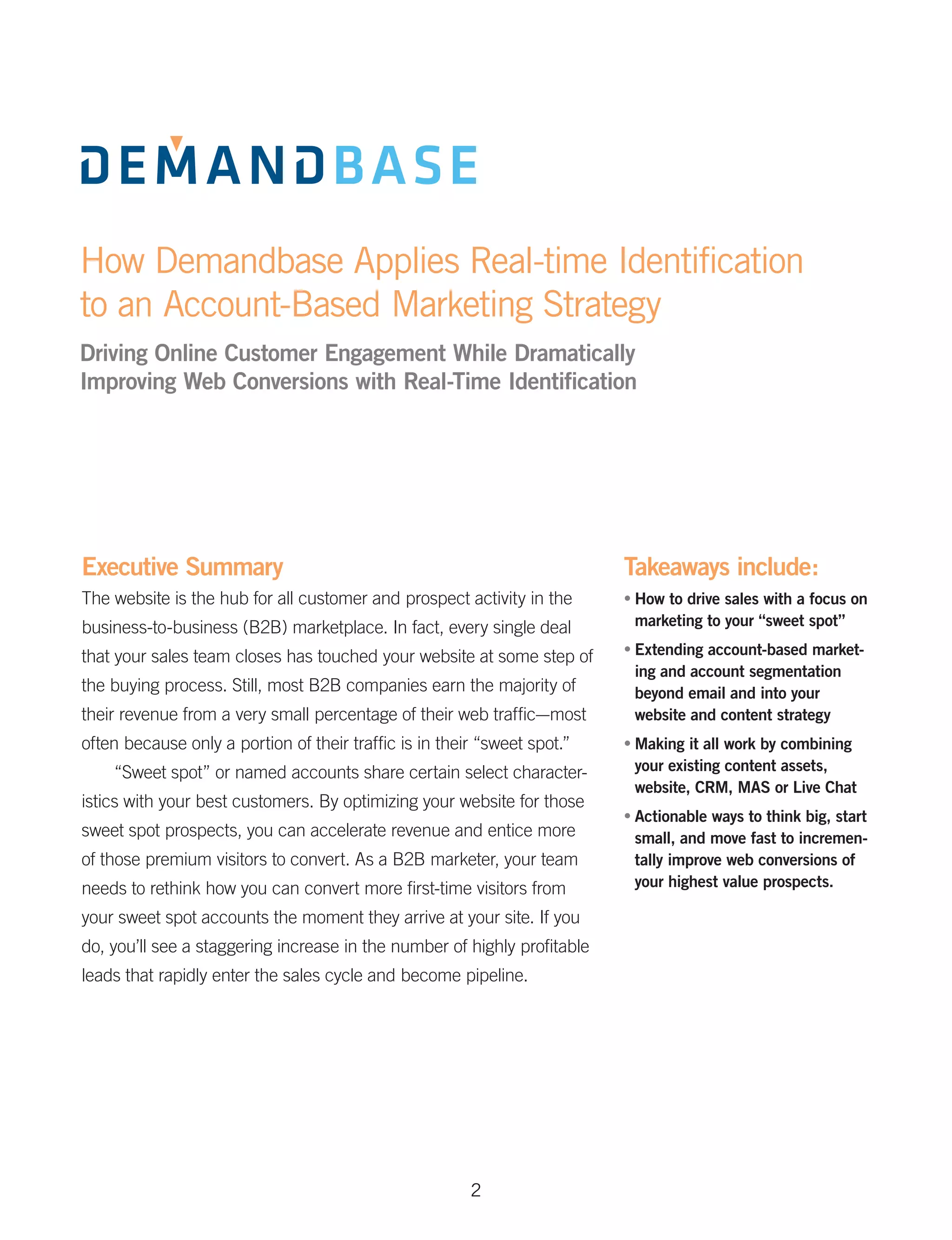 Demandbase utilizes real-time identification to enhance account-based marketing strategies, driving online engagement and significantly improving web conversions. The document outlines key tactics for B2B marketers, including the importance of targeting 'sweet spot' accounts and optimizing landing pages to capture leads effectively. It emphasizes an integrated approach to marketing that combines both personalized content and data-driven insights to better engage potential customers.