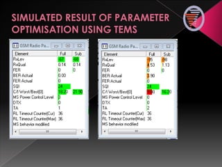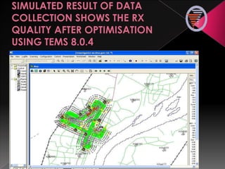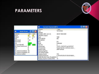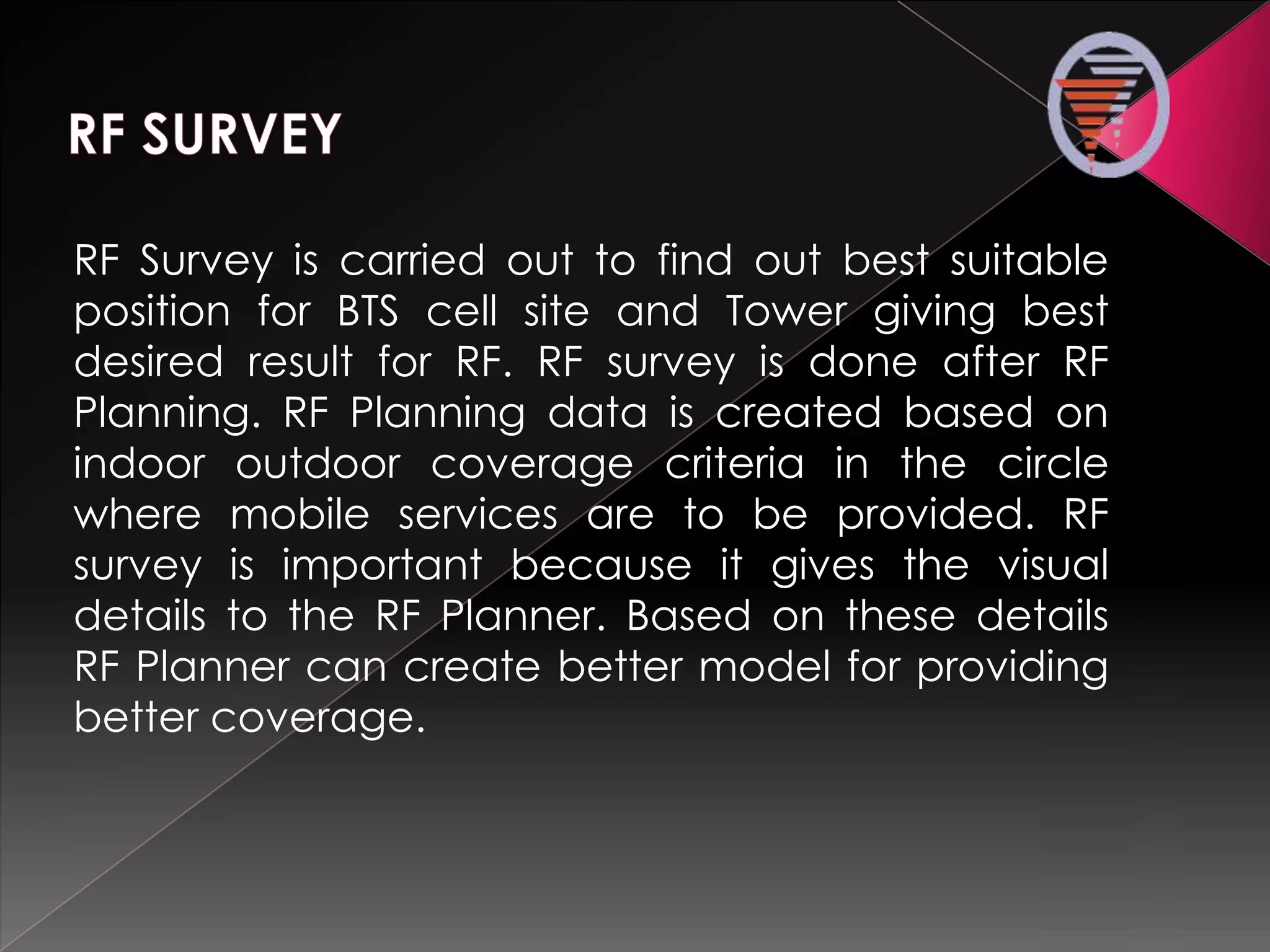 The document outlines the process and importance of RF surveys in determining optimal locations for BTS cell sites and towers to enhance mobile coverage. It details various surveys, tools, and methodologies used for both planning and post-launch optimization of wireless networks, including drive tests, data analysis, and performance measurement. Key parameters and techniques for assessing signal quality and coverage, such as RX level, BER, and sector orientation, are also discussed.