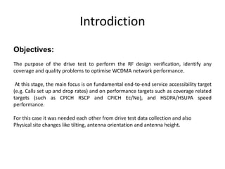 The document discusses objectives and equipment for conducting a drive test to verify RF design and optimize network performance of a WCDMA network. The main goals are to check for coverage and quality problems, and test performance targets like call setup rates, coverage metrics like CPICH RSCP and Ec/No, and HSDPA/HSUPA speed. Both a UE and scanner can be used, where the scanner measures all carriers and cells while the UE only measures what the network informs it to. Parameters are checked before starting to ensure sites are functioning properly and neighbors are defined correctly.