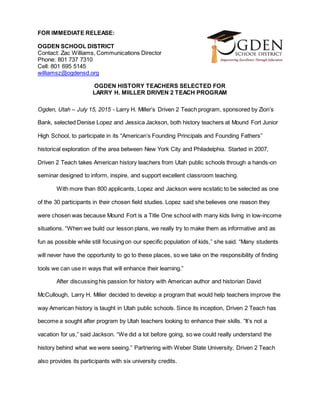 Two history teachers from Mound Fort Junior High School, Denise Lopez and Jessica Jackson, were selected to participate in the Driven 2 Teach program which takes teachers on historical trips between New York City and Philadelphia. The program, started in 2007 by Larry H. Miller, aims to enhance history teaching in Utah schools. Lopez and Jackson believe the hands-on experience will help them engage students in low-income areas. They plan to incorporate primary sources and historical novels into their lessons after learning new teaching strategies on the trip.