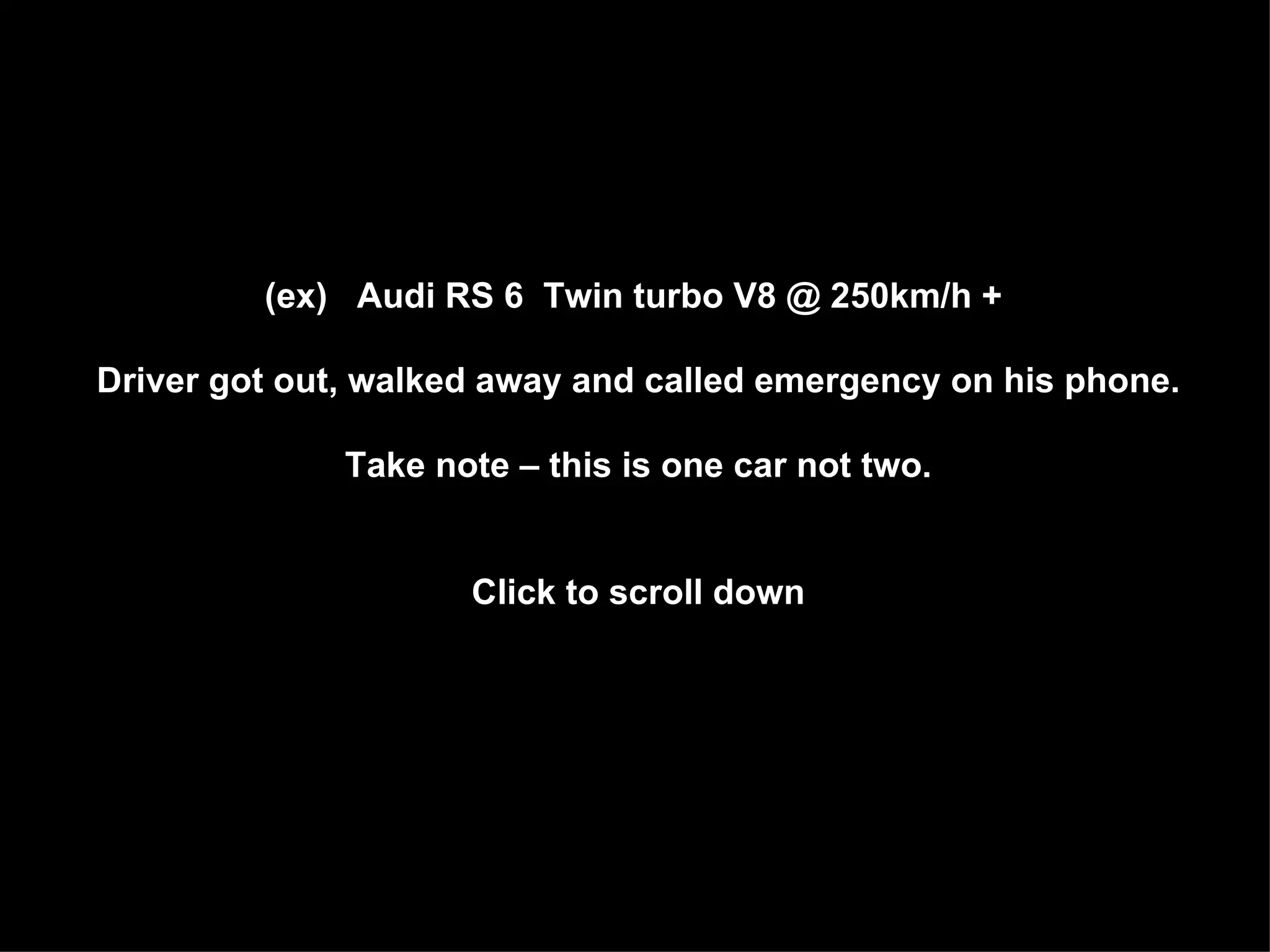 The document discusses a single Audi RS 6 car with a twin turbo V8 engine that was traveling at 250km/h. The driver got out of the car while it was still moving, walked away, and called emergency services on his phone. It notes that this incident involved just one car, not two.