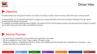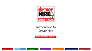The document introduces Driver Hire, an Australian company that provides temporary staffing, permanent recruitment, and other services for the transport and logistics industry. It highlights Driver Hire's 24/7 availability, national coverage, and over 30 years of experience. The document also describes Driver Hire's recruitment process, which includes skills testing, license and reference checks, and interviews to ensure high quality candidates are placed with clients. Driver Hire also offers additional services like training and online skills assessments tailored to clients' specific needs.