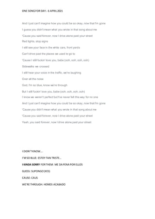 The document is the lyrics to the song "Driver's License" by Olivia Rodrigo. It summarizes her sadness over breaking up with her boyfriend. Some key details: She recently got her driver's license and was excited to drive to his house, but now drives through the suburbs crying because he's not around anymore. She sees his face in cars and hears his voice, expressing she still loves him but they are over.