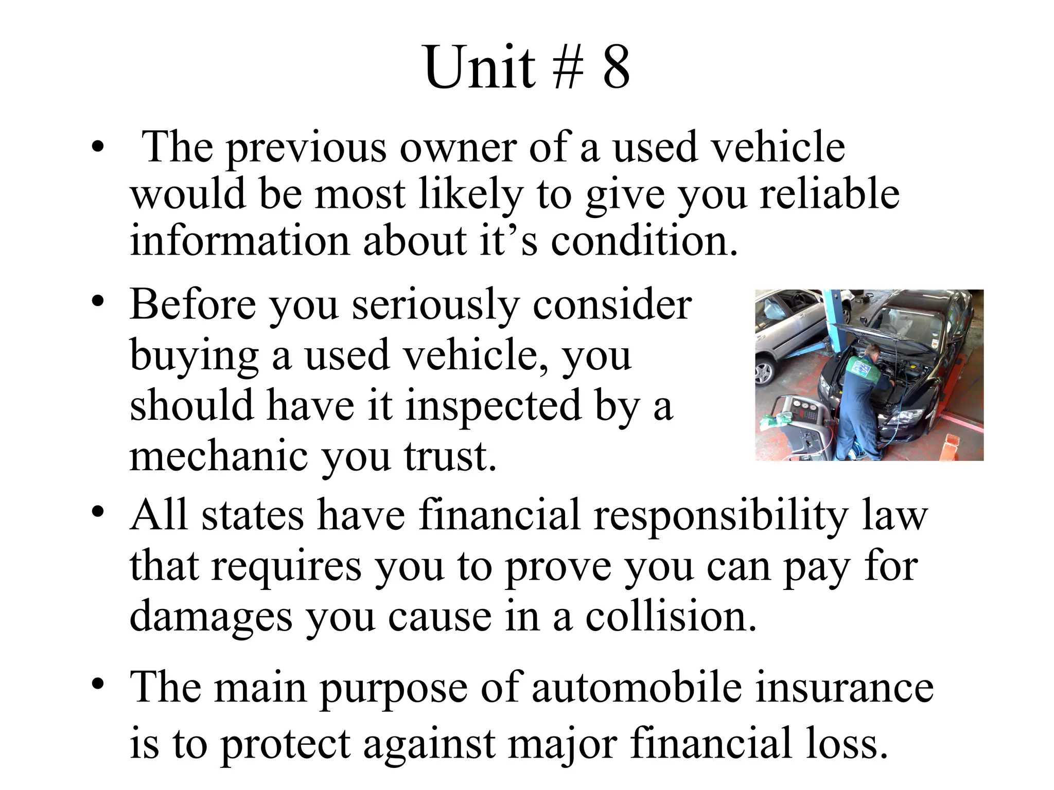 The document provides information about maintaining and operating a vehicle. It discusses inspecting used vehicles, types of automobile insurance, warning lights, fuel efficiency, tire pressure, maintenance vs repairs, jump starting a dead battery, long distance travel tips, and selecting safe routes. Overall, the document offers guidance on properly caring for a vehicle and driving safely.