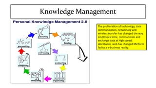 This document discusses drivers, challenges, tools, and lifecycle of knowledge management. It identifies the main drivers as technological, process-related, personnel-specific, knowledge-related, and financial. The key challenges are convincing organizations and employees of knowledge management's value, capturing and processing knowledge, addressing collaboration, ongoing research, and dealing with tacit knowledge. Common tools include internet/intranets, videoconferencing, knowledge sharing, knowledge centers, and cross-departmental teams. Finally, it describes knowledge lifecycle as moving from creation to mobilization, diffusion, and commoditization.