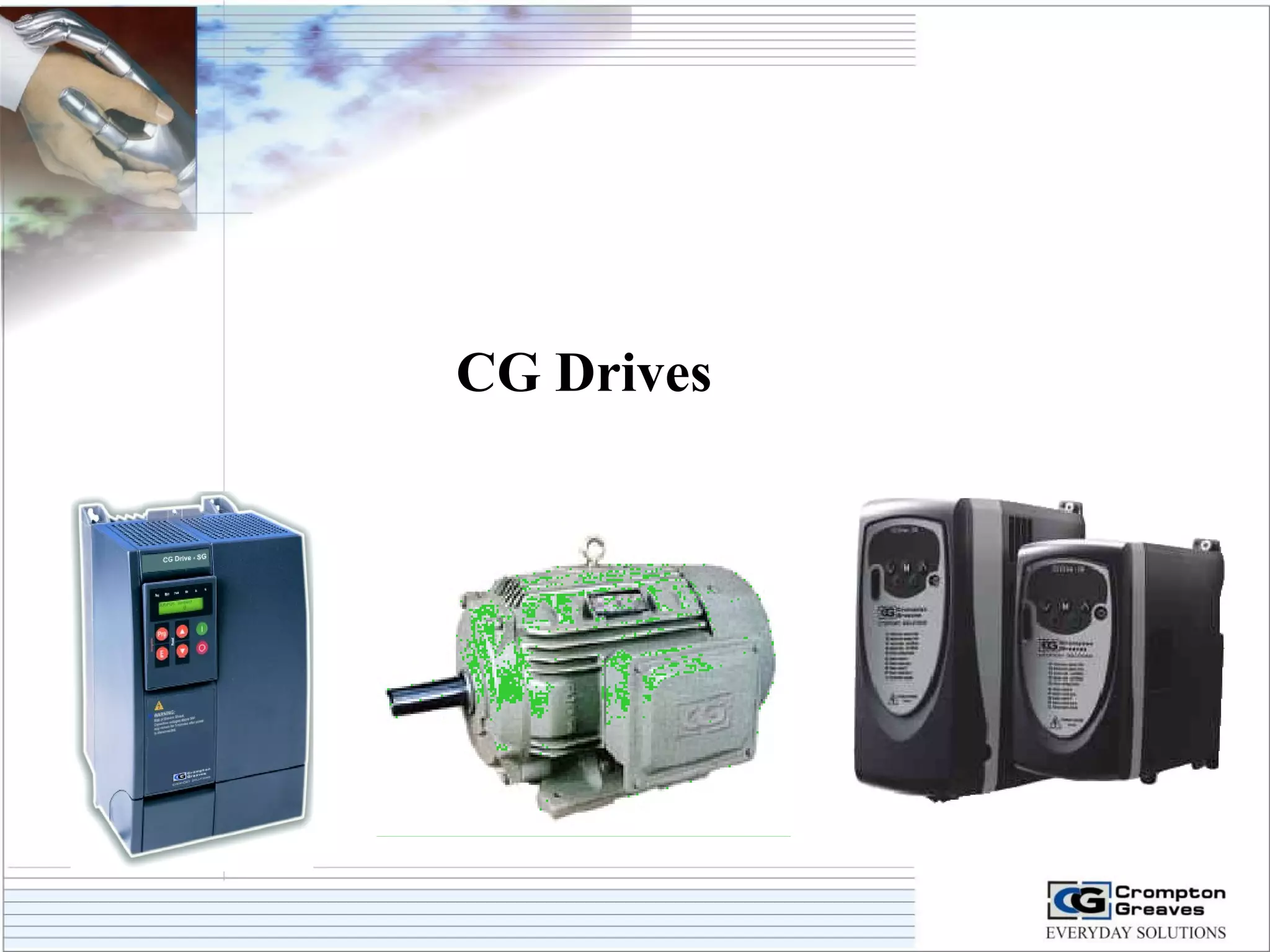 The document provides information on AC drives from CG Drives, including their advantages, basic principles of operation, operating modes, braking types, and models. It discusses constant torque and variable torque loads, open loop V/F and vector control modes, closed loop vector control using feedback, and dynamic, DC injection, and regenerative braking methods. It also introduces the CG Drive-SK and CG Drive-SG product lines, specifying their features, connections, dimensions, and optional additions.