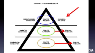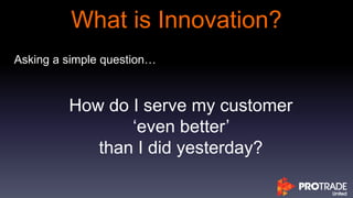 The document focuses on fostering innovation within businesses by encouraging leaders to think differently, understand customer needs, and embrace a culture of constant improvement. It outlines barriers to innovation, offers strategies for enhancing customer experience, and emphasizes the importance of leadership and trust in driving change. Additionally, it proposes thought-provoking questions to stimulate creative thinking and disrupt the status quo.