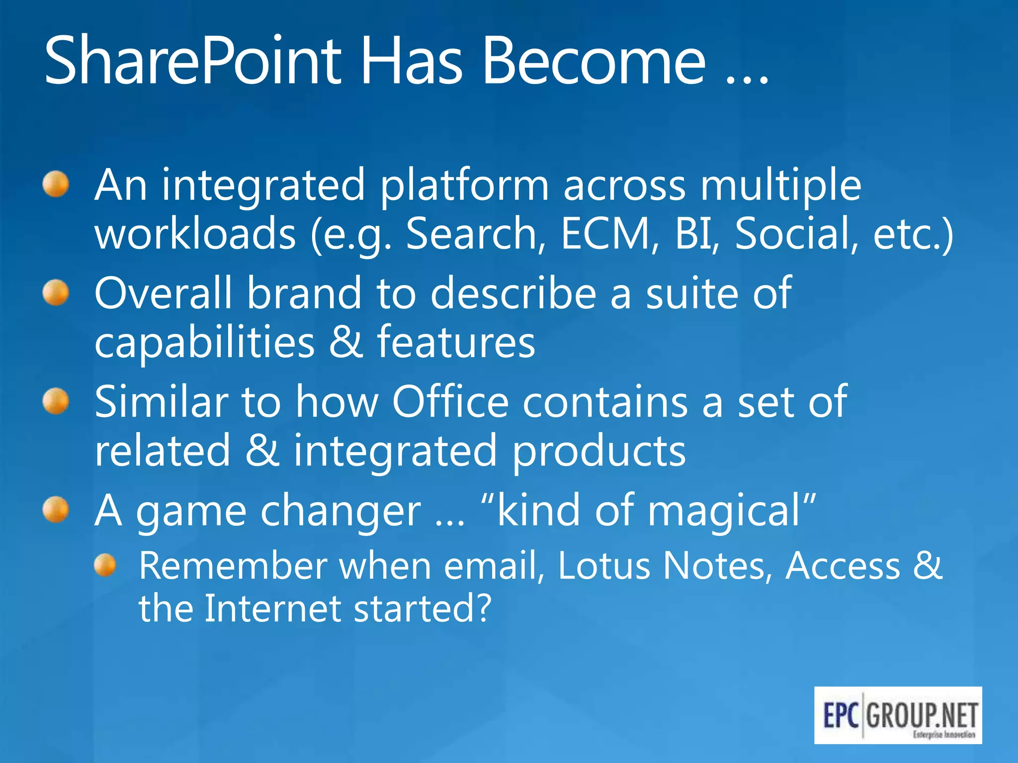 The document provides an extensive overview of SharePoint, detailing its features such as business connectivity services, collaborative tools, content management, and integration capabilities. It discusses the evolution of SharePoint from 2010, highlighting its growing complexity and the challenges organizations face in managing SharePoint as a critical enterprise application. Additionally, it addresses the need for effective integration with existing technologies and the importance of managing SharePoint sprawl across multiple farms and site collections.