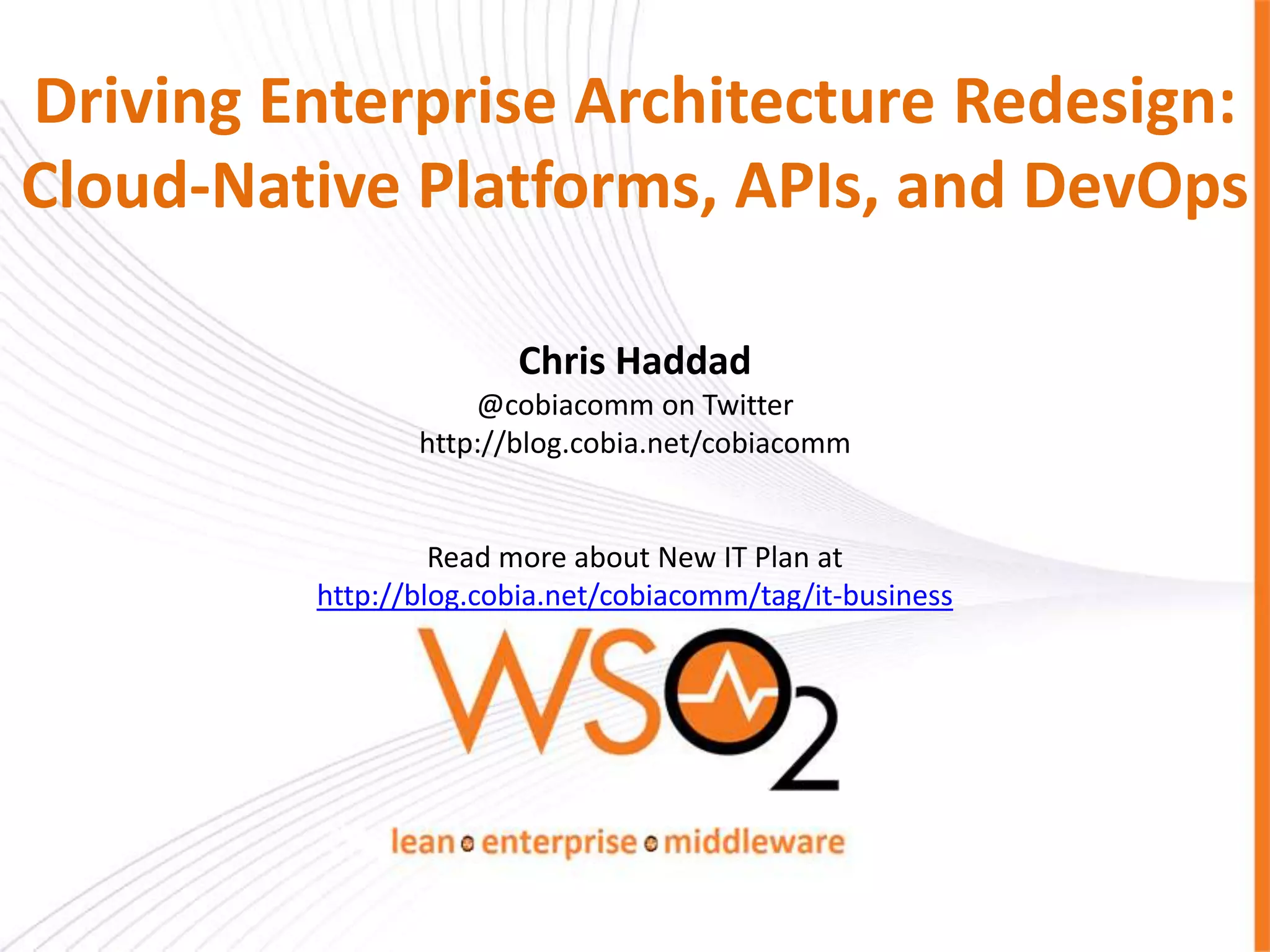The document discusses enterprise architecture redesign with a focus on cloud-native platforms, APIs, and DevOps principles. It highlights the evolution of web technologies and the necessity of agile architecture for enhancing business agility and collaboration. Key aspects include governance, process automation, and the impact of APIs on promoting innovation and user experience in a digital business ecosystem.