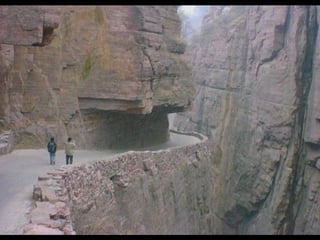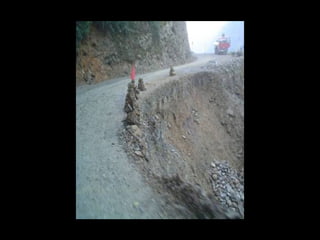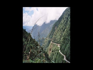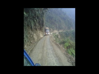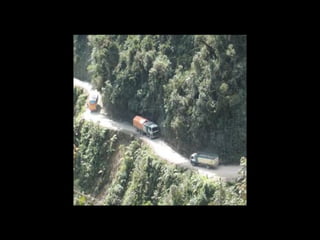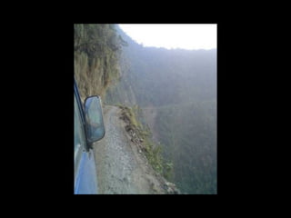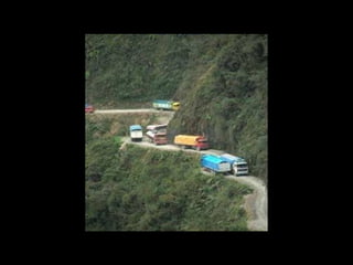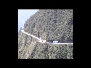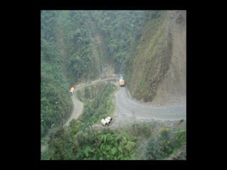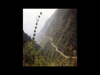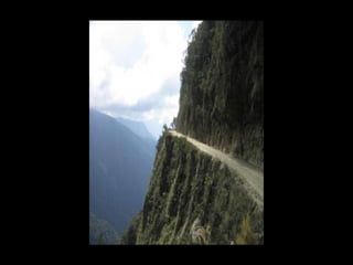The document discusses a mountainous highway in Bolivia called Stremnaya Road that is nicknamed "the road of death". It is a dangerous road situated in Bolivia that winds through mountainous terrain. Driving on this road is risky due to its steep cliffs and lack of safety features.